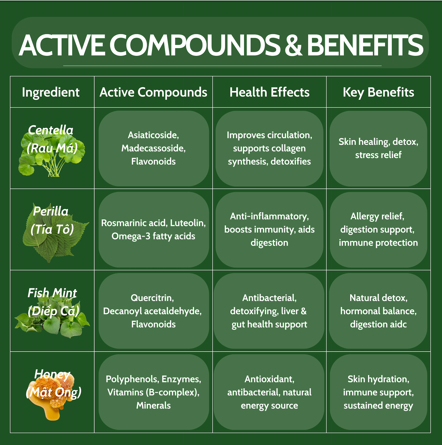 Ingredients: Centella (Gotu Kola) Leaf, Perilla Leaf, Fish Mint (Houttuynia Cordata) Leaf, Honey Powder