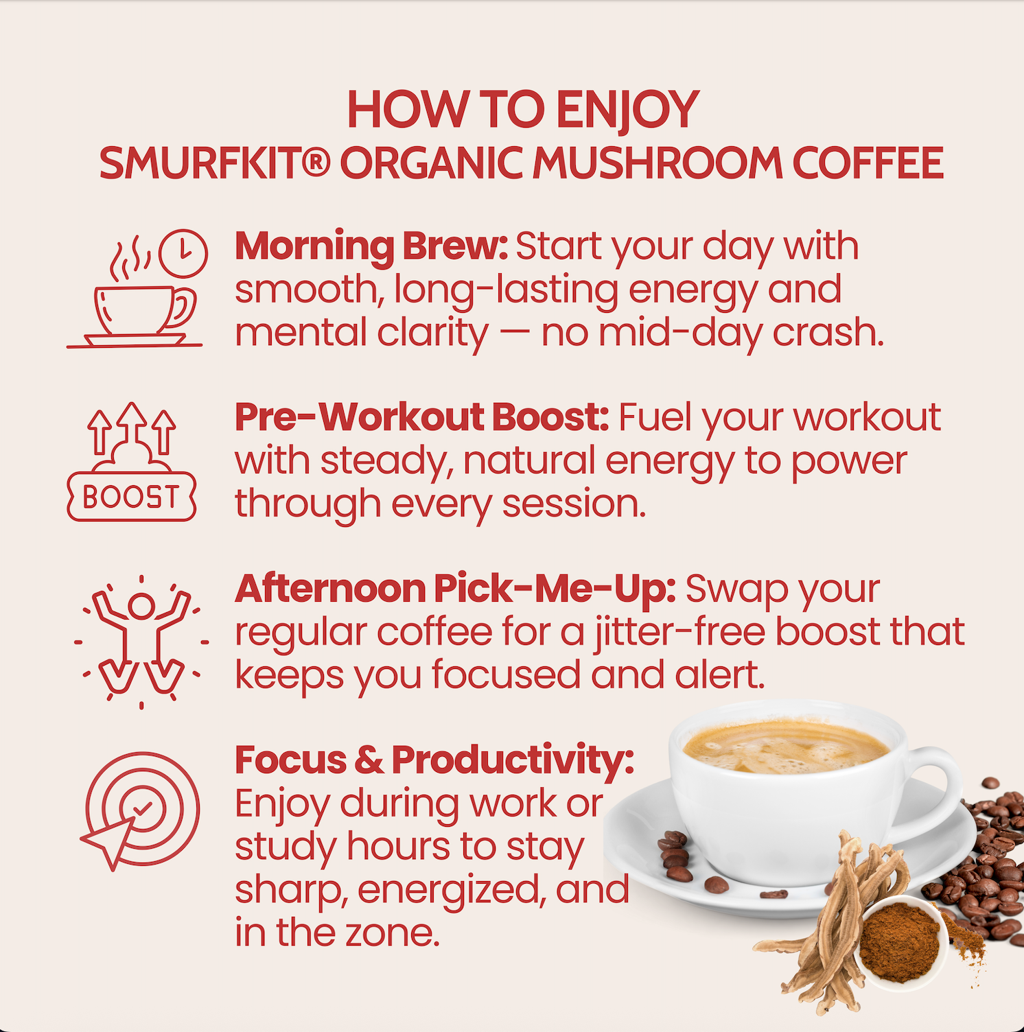 → Smurfkit® Organic is a premium wellness brand offering functional beverages like mushroom coffee and herbal blends designed to support energy, focus, immunity, and overall wellness.