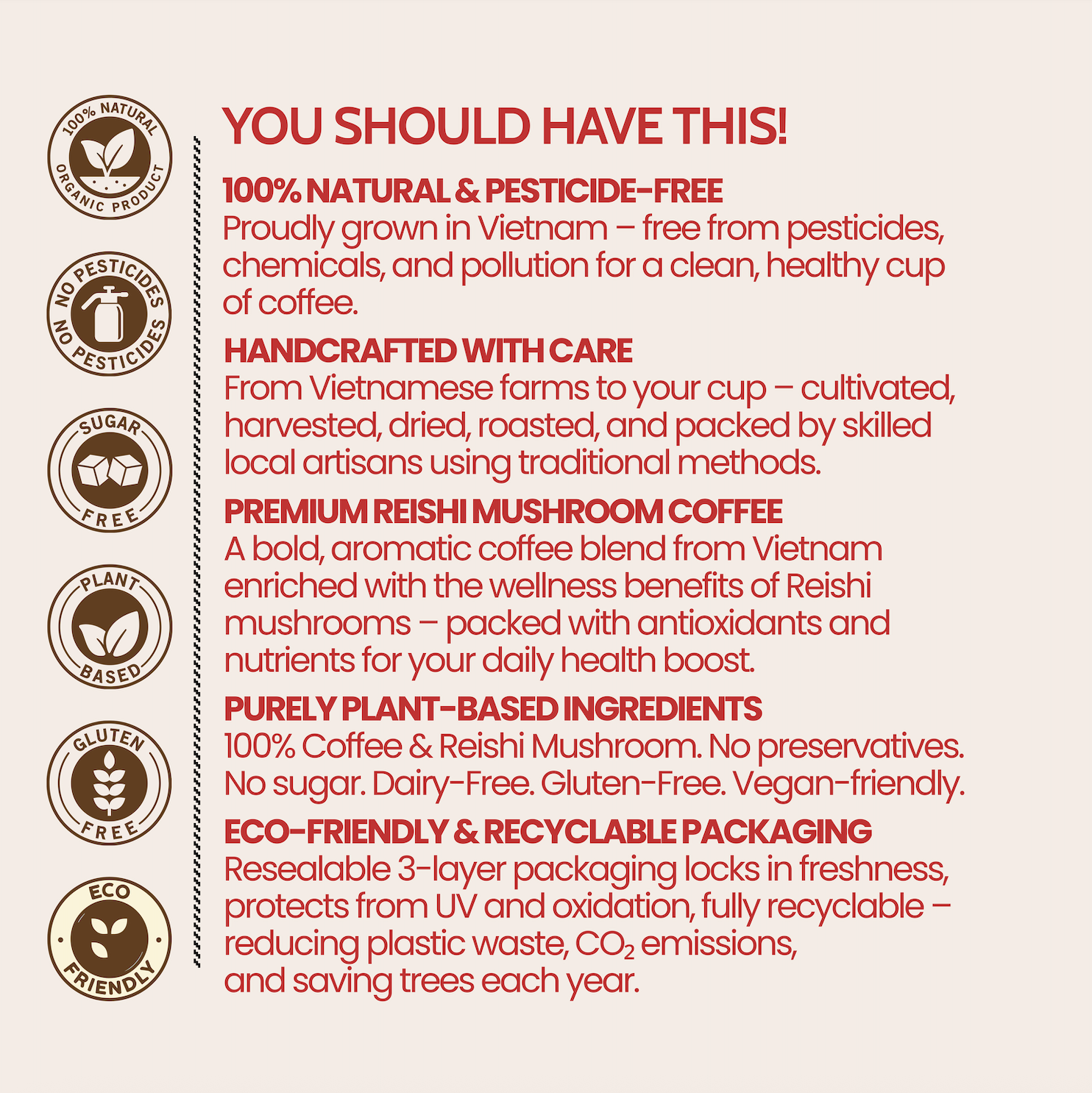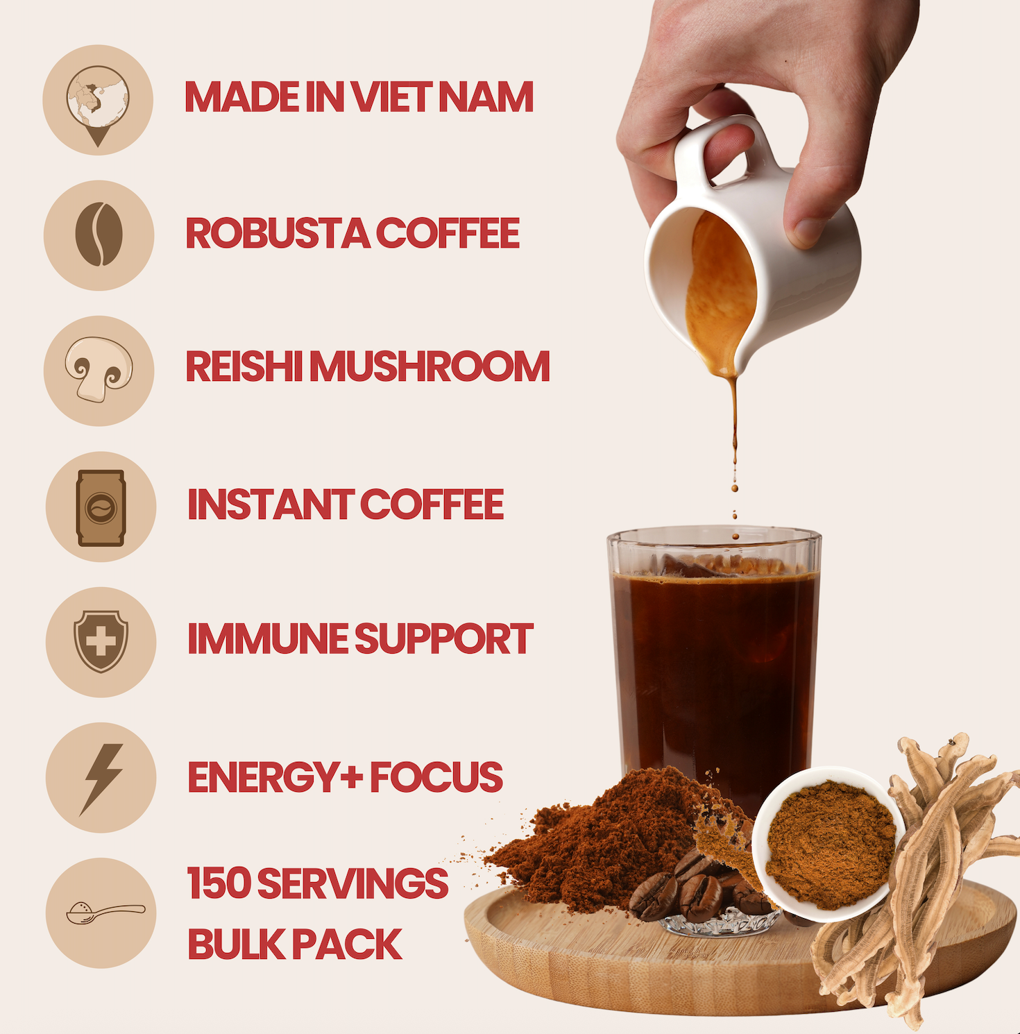Ingredients: Organic Instant Coffee Powder (Robusta), Reishi Mushroom