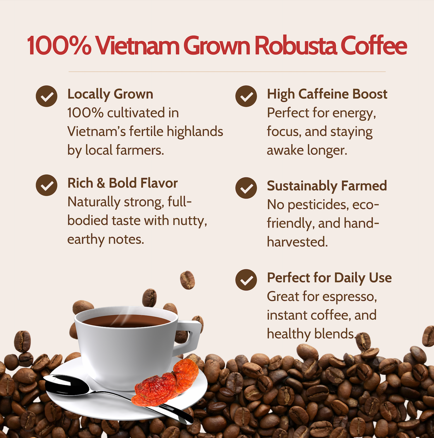 ☕ Smooth, Steady Energy: Vietnamese Robusta for a rich, bold flavor and long-lasting energy without the crash.